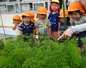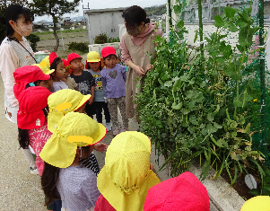 園庭で全てを行っているので水やりや収穫を行っている年長児だけではなく全てのクラスの子ども達が芽が出てきたり、野菜が実っていく姿を見て感じる事が出来ます。