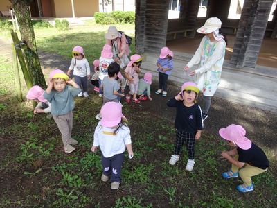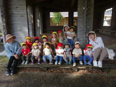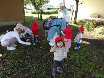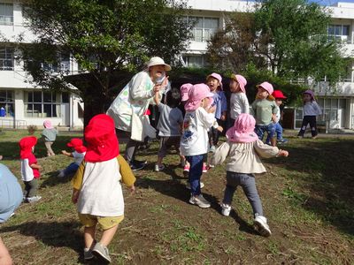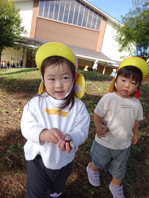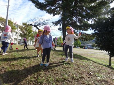 各務小学校に遠足に行きました。 夢中でどんぐりを手で持ちきれないほど拾いました。 拾ったどんぐりをお山で転がして遊んだり山を登ったりして遊びました。