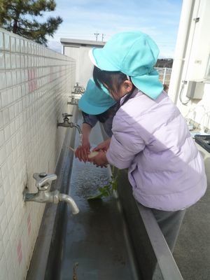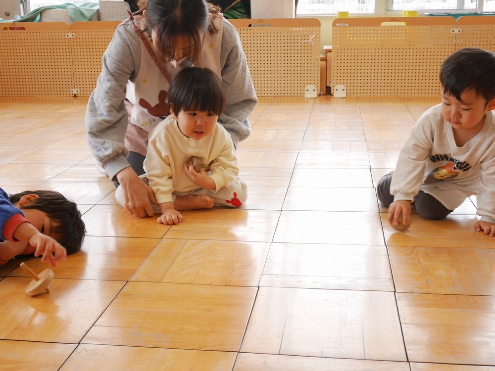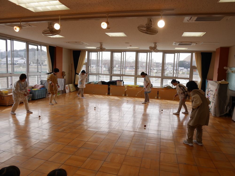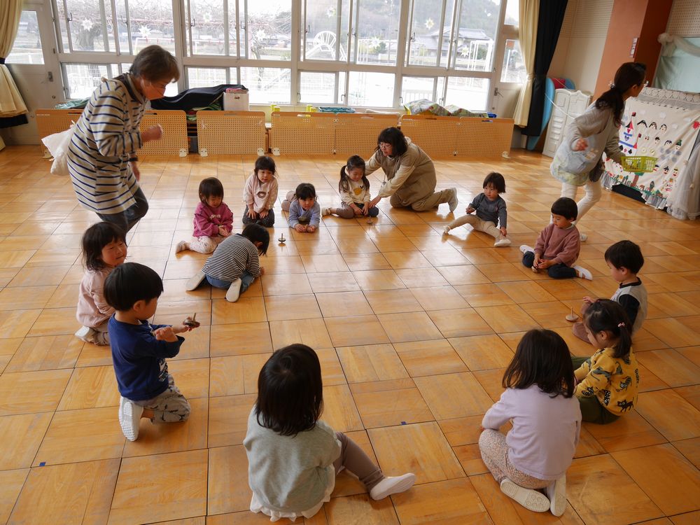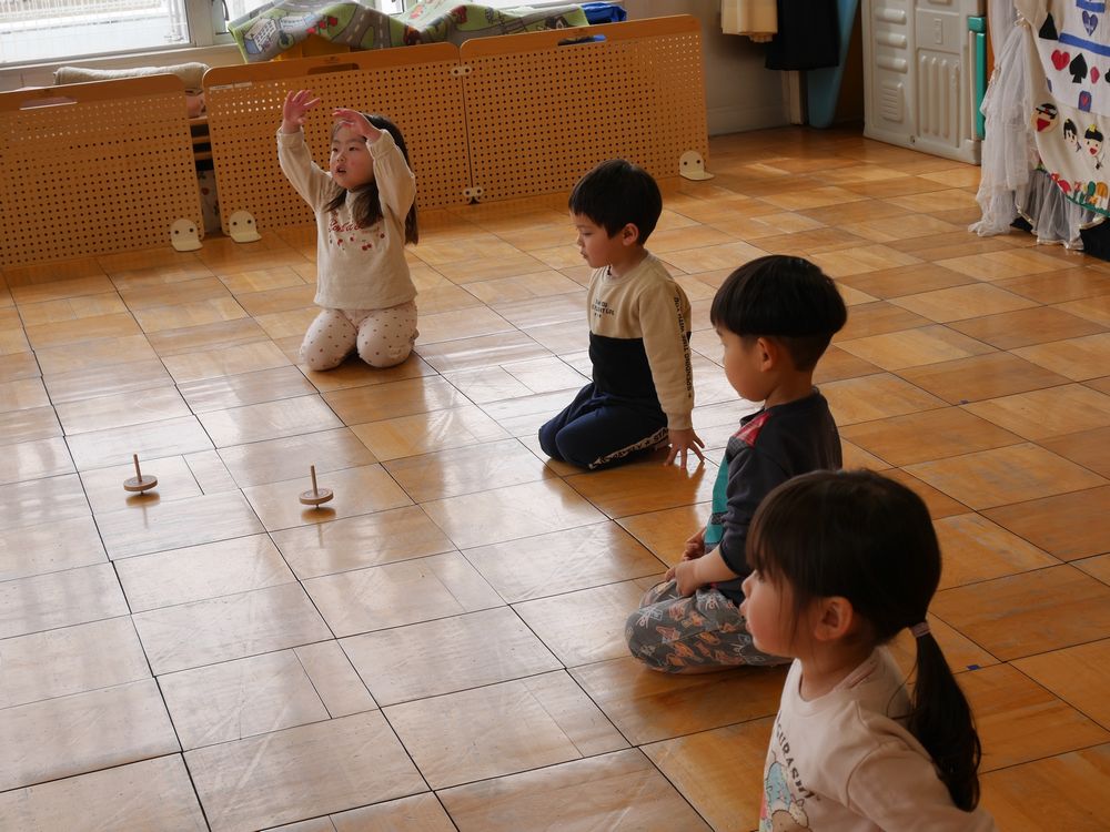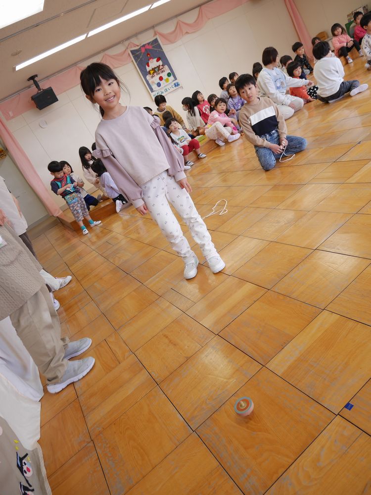 各務保育園の皆でこま回し大会をしました。